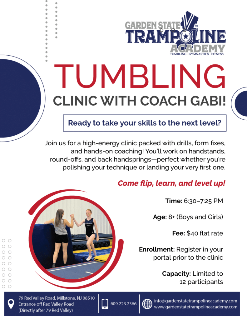 Students will also learn foundational safety practices, equipment use and jumping techniques. Our highly qualified coaches focus on individualized skill development, ensuring correct technique and form, while helping each athlete achieve their personal goals. Whether for cheerleading, gymnastics, dance, or recreation, this program is perfect for your child!